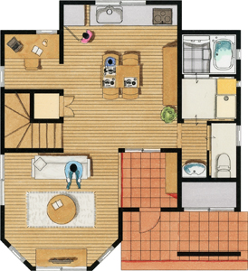 | 多角形が特徴の外観は、ヨーロッパの瓦をイメージして採用している大屋根と、多角形の組み合わせにより洋館風のものとなりました。DKの延長に書斎コナーを配置することで団らんの延長に趣味の世界が広がります。 |