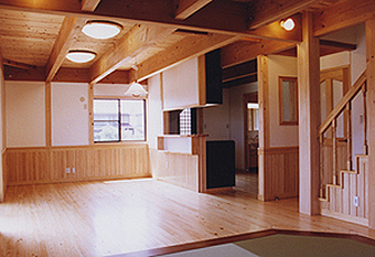 外観をベーシックな洋風にし、内部は柱や梁を表し仕上げとしています。また、天井にも無垢の杉材を使用しました。 |